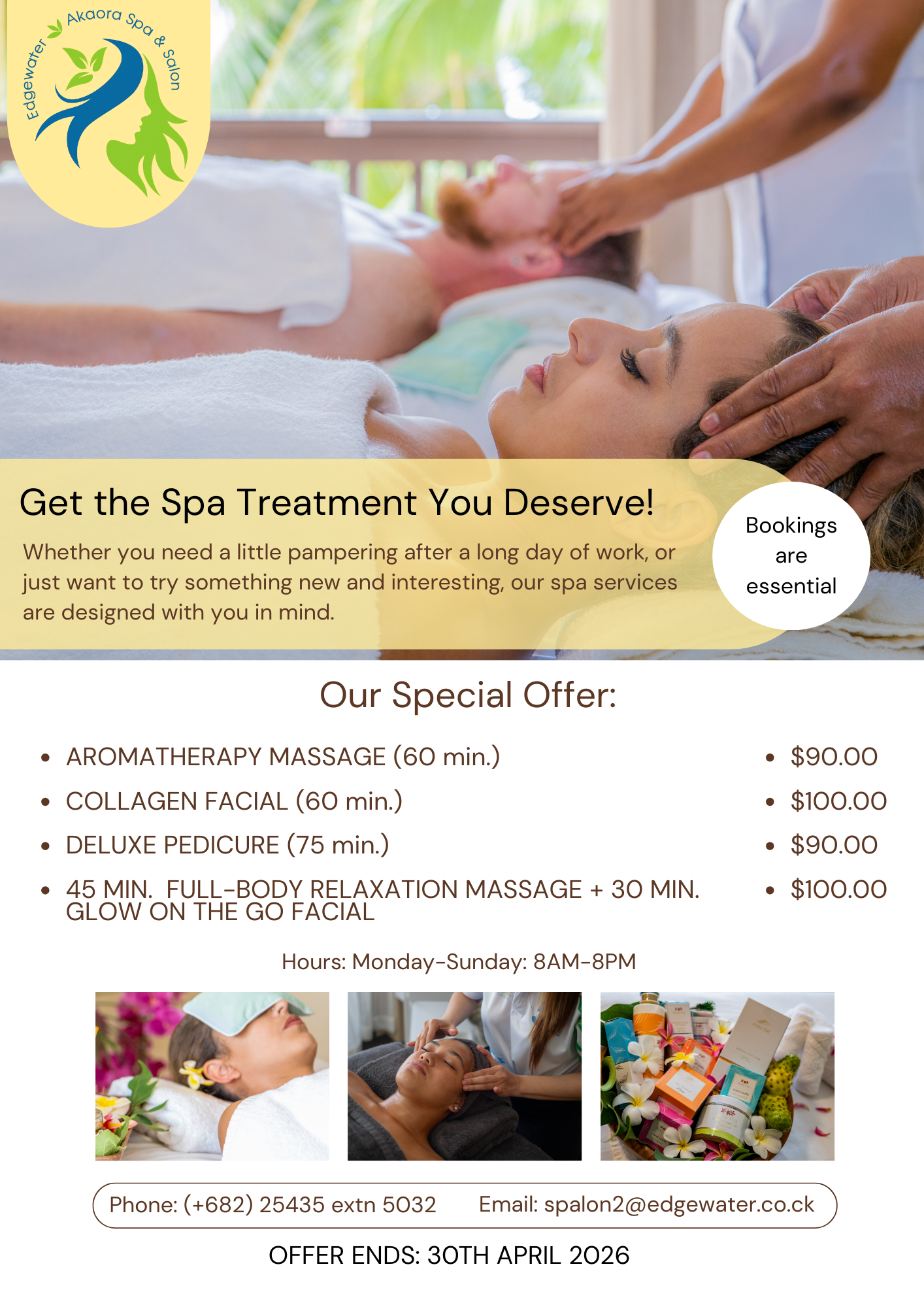 The Edgewater’s Akaora Spa & Salon is open daily, 8am–8pm.